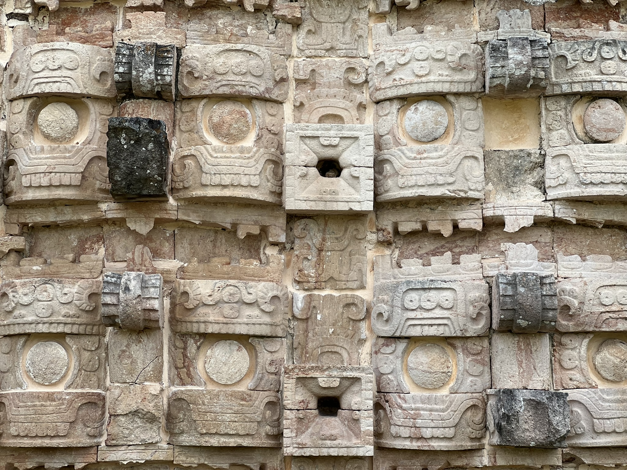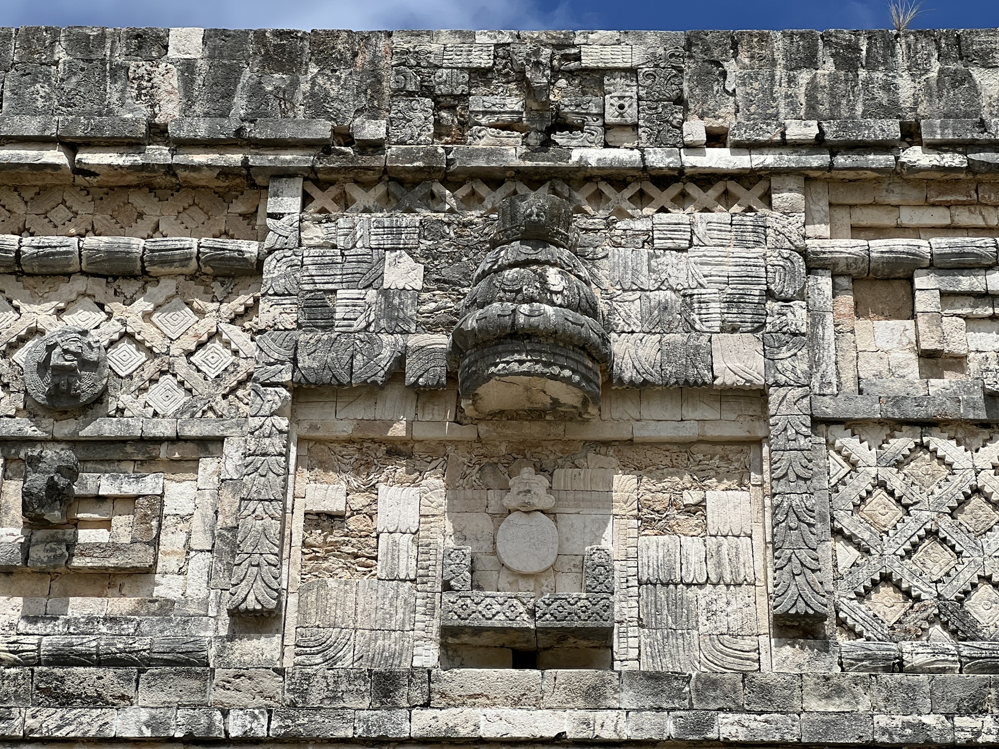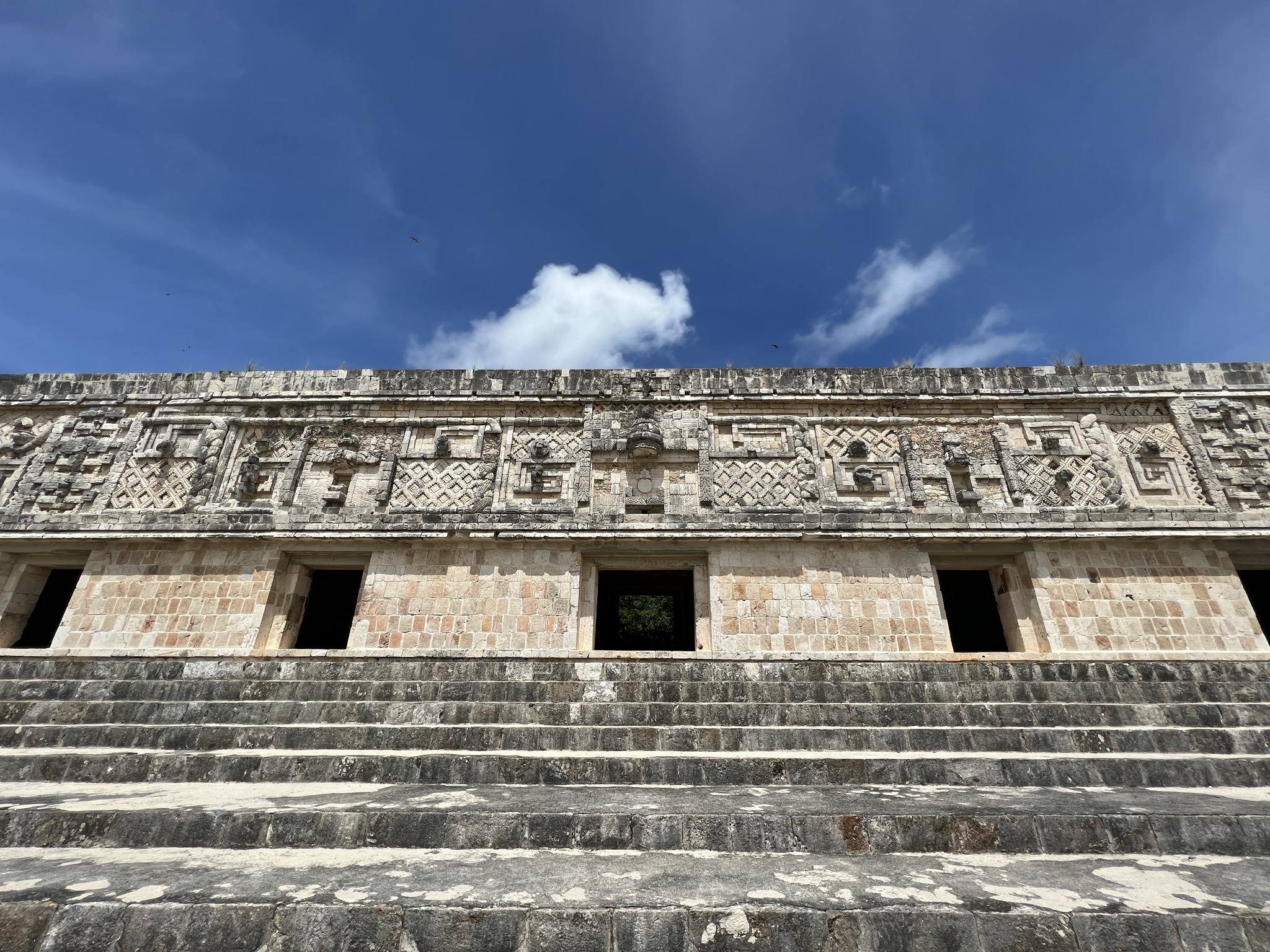 Another majestic and important building is the Palace of the Governor. It stands on a massive, three-tiered platform, is exceptionally long, and is impressively aligned with a pyramid located about five kilometres away. Every eight years, Venus sets behind the palace’s northern edge, marking the advent of the rainy season. For this reason, around 400 glyphs of the planet adorn the various Chaac masks. Also of note, Dominic told us that the Mayans believed Venus ate the sun during an eclipse – so they would perform human sacrifice to quell the god’s ire.