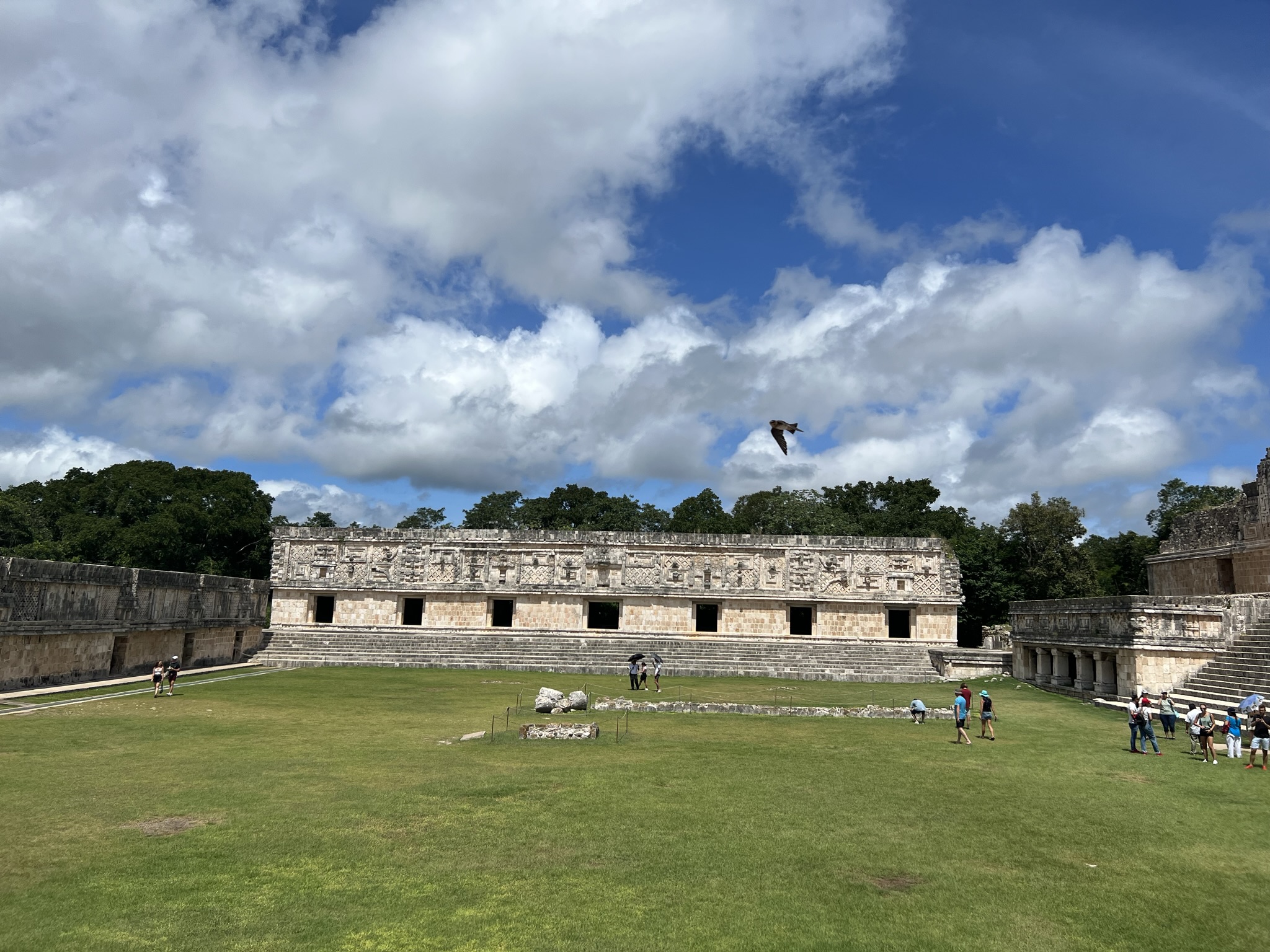 To the west of the oval pyramid is the Nunnery Quadrangle: a courtyard flanked on each side by impressive palaces. I couldn’t help but feel tranquil and connected while traipsing across the grass covering the courtyard, surrounded by the birds and iguanas that have replaced the Mayans as the city’s new inhabitants. Little do they know how rich in history their land is – an impression that becomes clear upon entering the palace on the west side: a structure adorned with several masks of Chaac and filled with chambers that reek of bird and bat droppings.