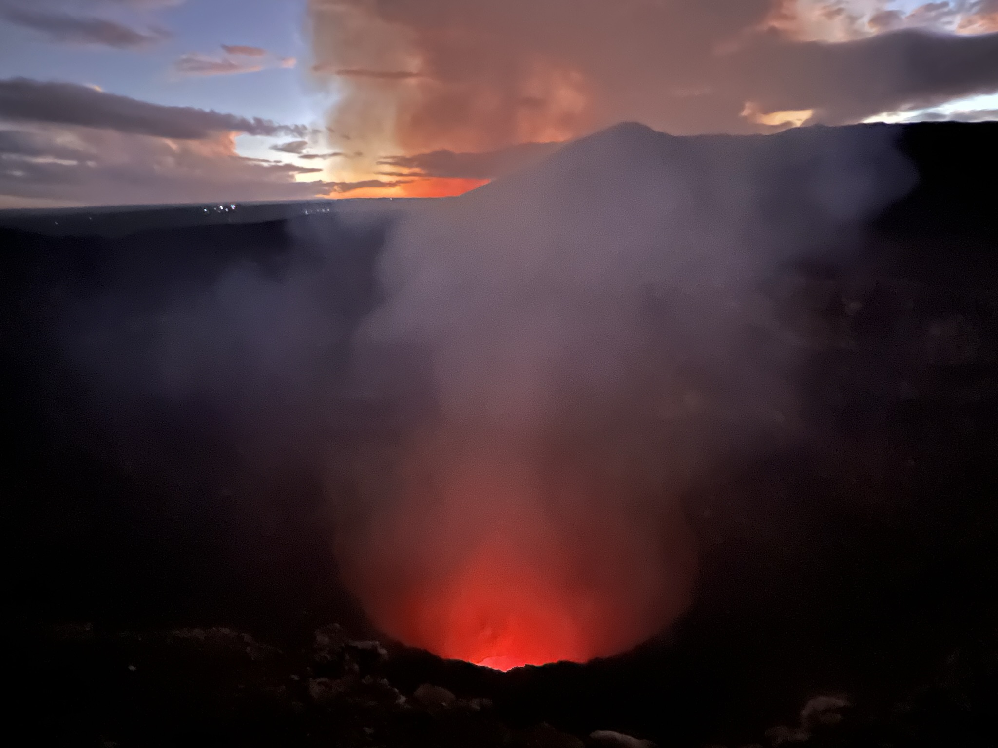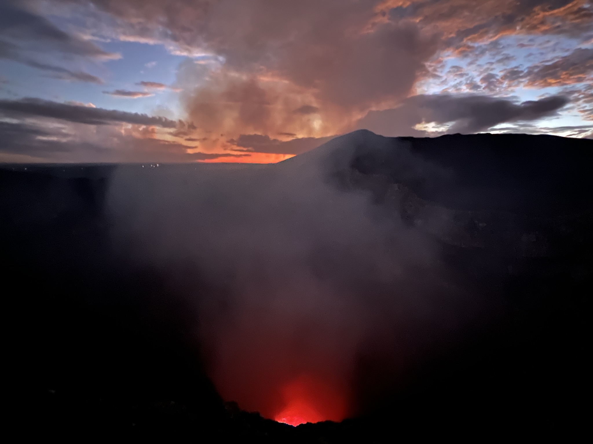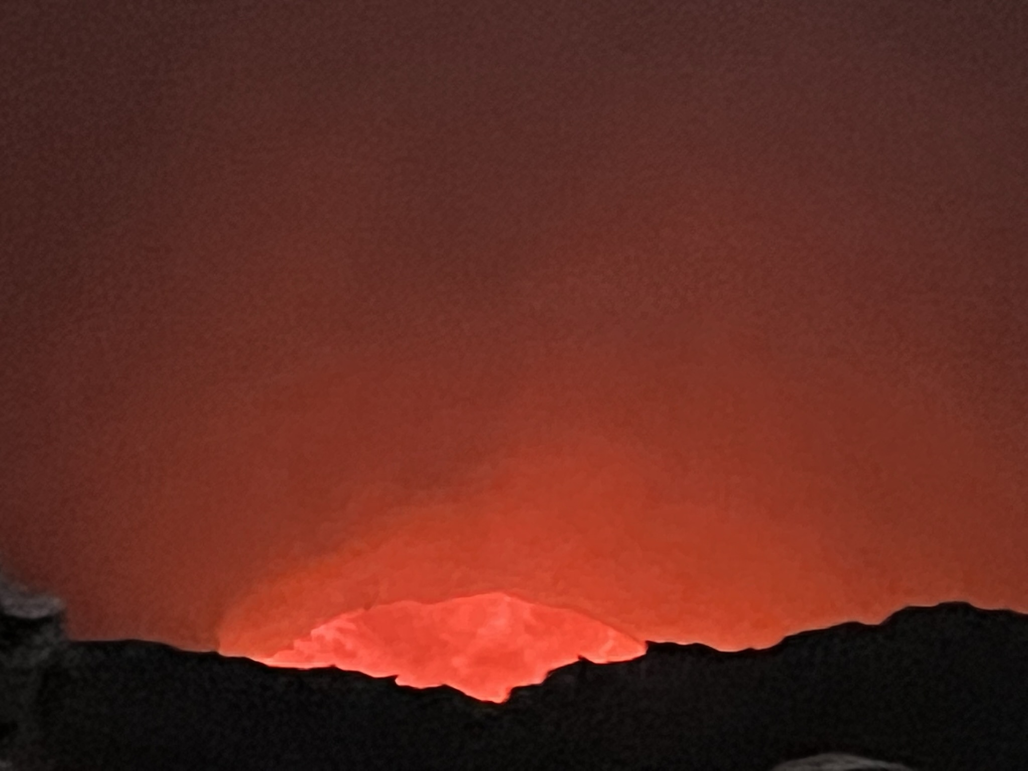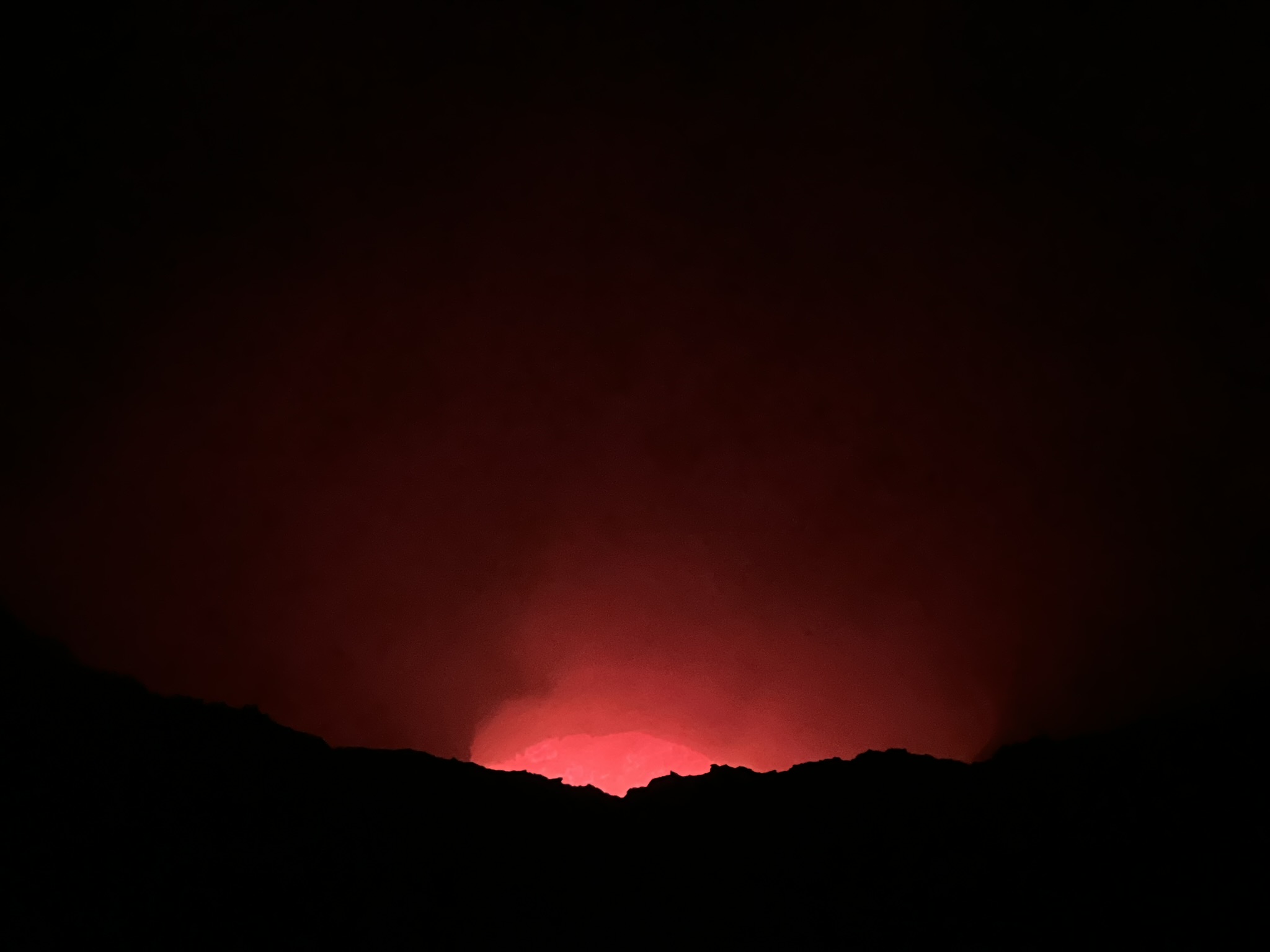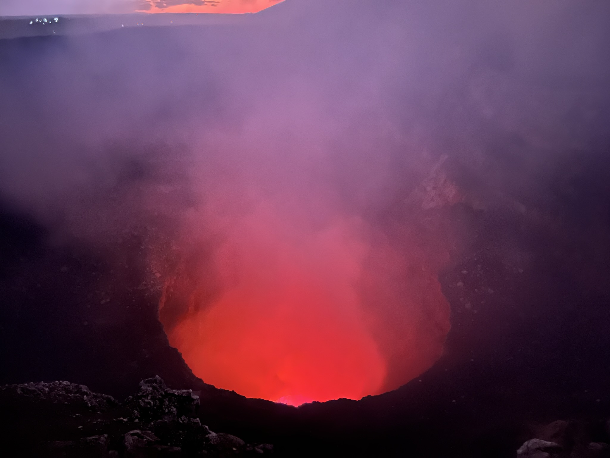 Now under the cover of darkness, we made our way down the hill and back to the rim of the Santiago crater, where the most incredible of views awaited us – the incandescent red lava pool at the bottom of the crater. I was genuinely mesmerised, unable to take my eyes off the glowing lake as different shades of red bubbled and mixed, plumes of gas constantly threatening to cloud our view. As a self-diagnosed pyromaniac, this was an absolute bucket-list moment for me. While I had seen red-hot lava sputtering from Acatenango back in Guatemala, seeing this pool was something else entirely.