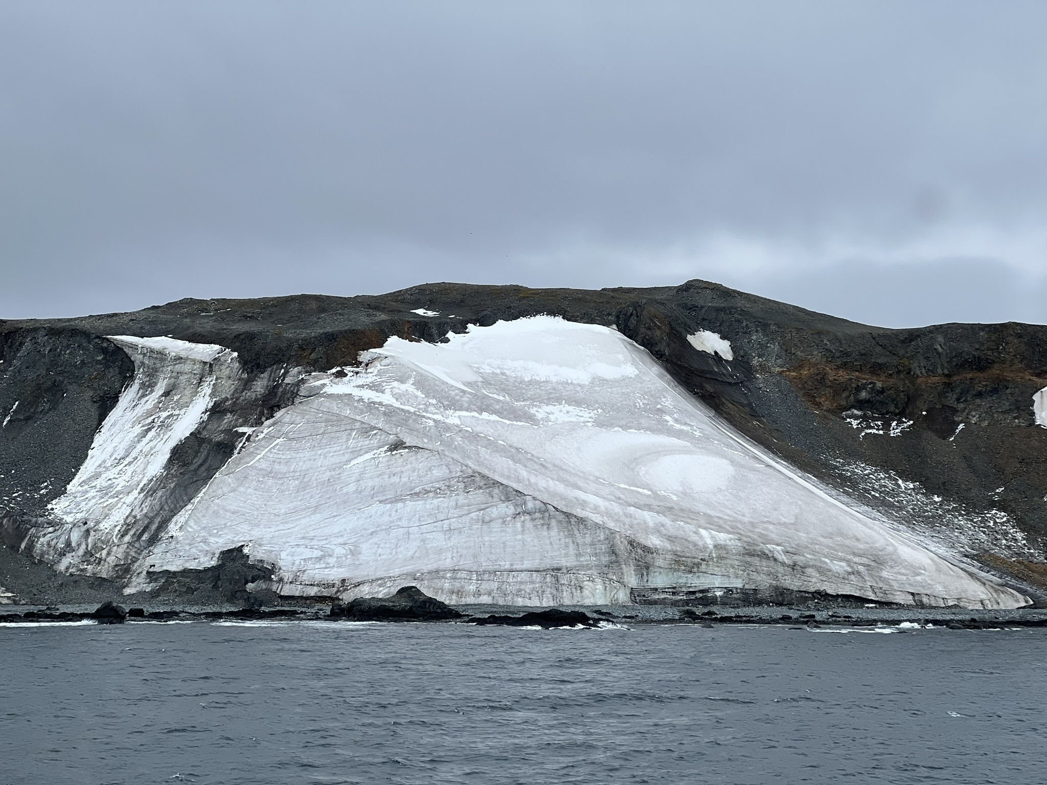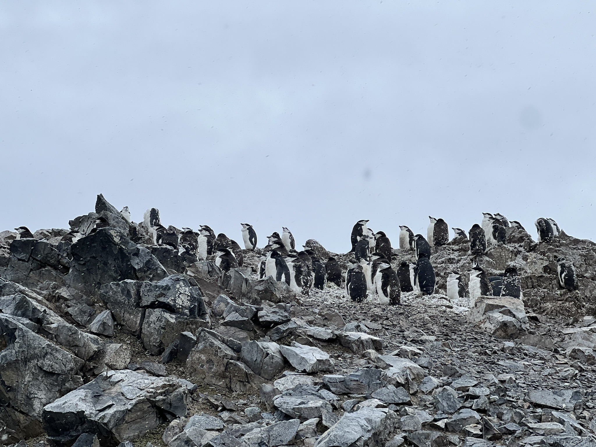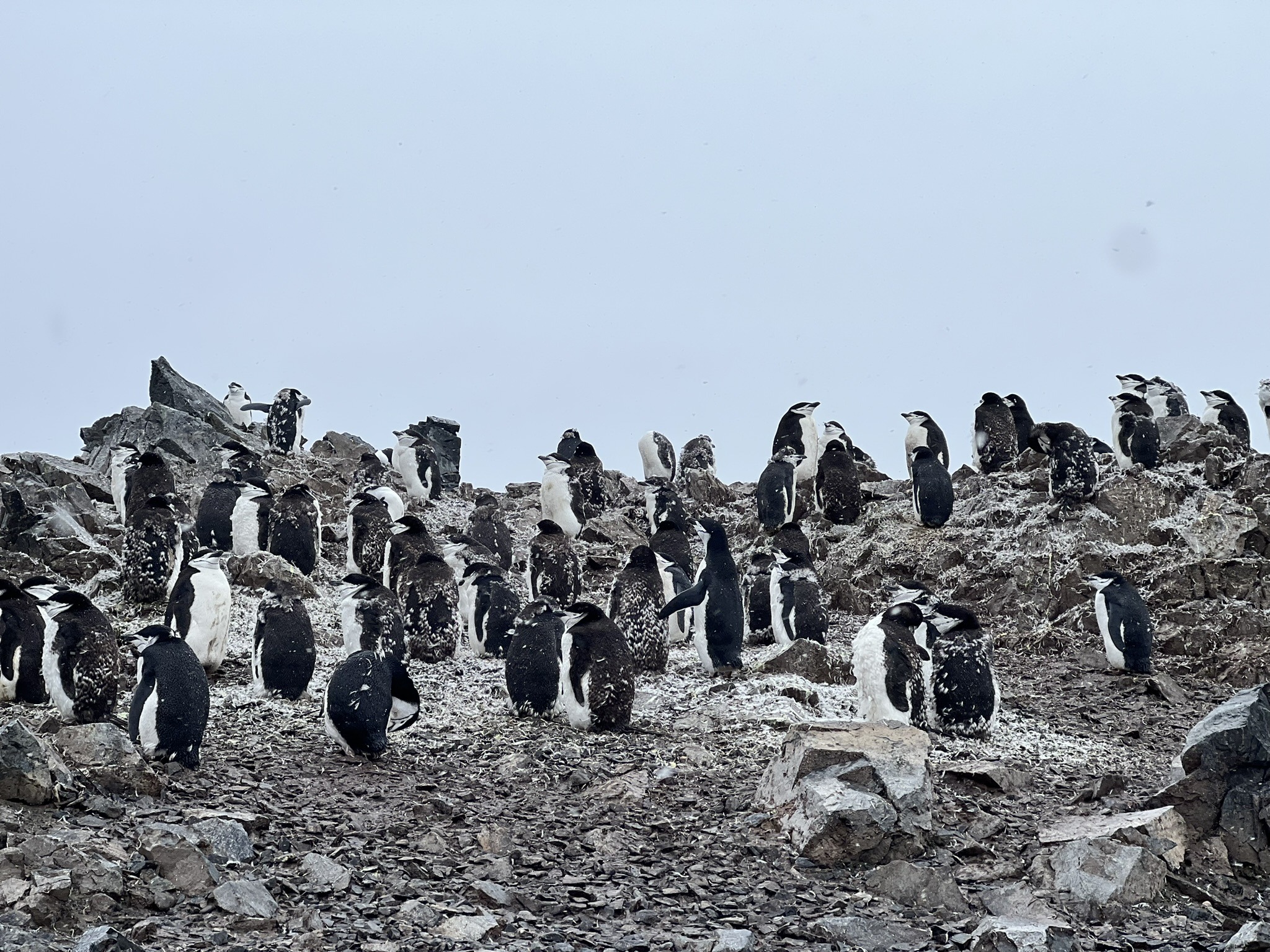 The trail leading to the island’s isthmus was bordered by jagged piles of black rock. What looked harsh and unforgiving to us was clearly a playground for chinstraps, who shuffled, jumped, slid, and tumbled off the rocks in a tragically hilarious display. I have no idea how they manage to fall several metres, pop back up, and continue on like nothing happened. As Heidi had mentioned during a lecture, these birds are built for swimming, not walking. That said, I fared no better on the slick terrain as I clambered up the hill myself.