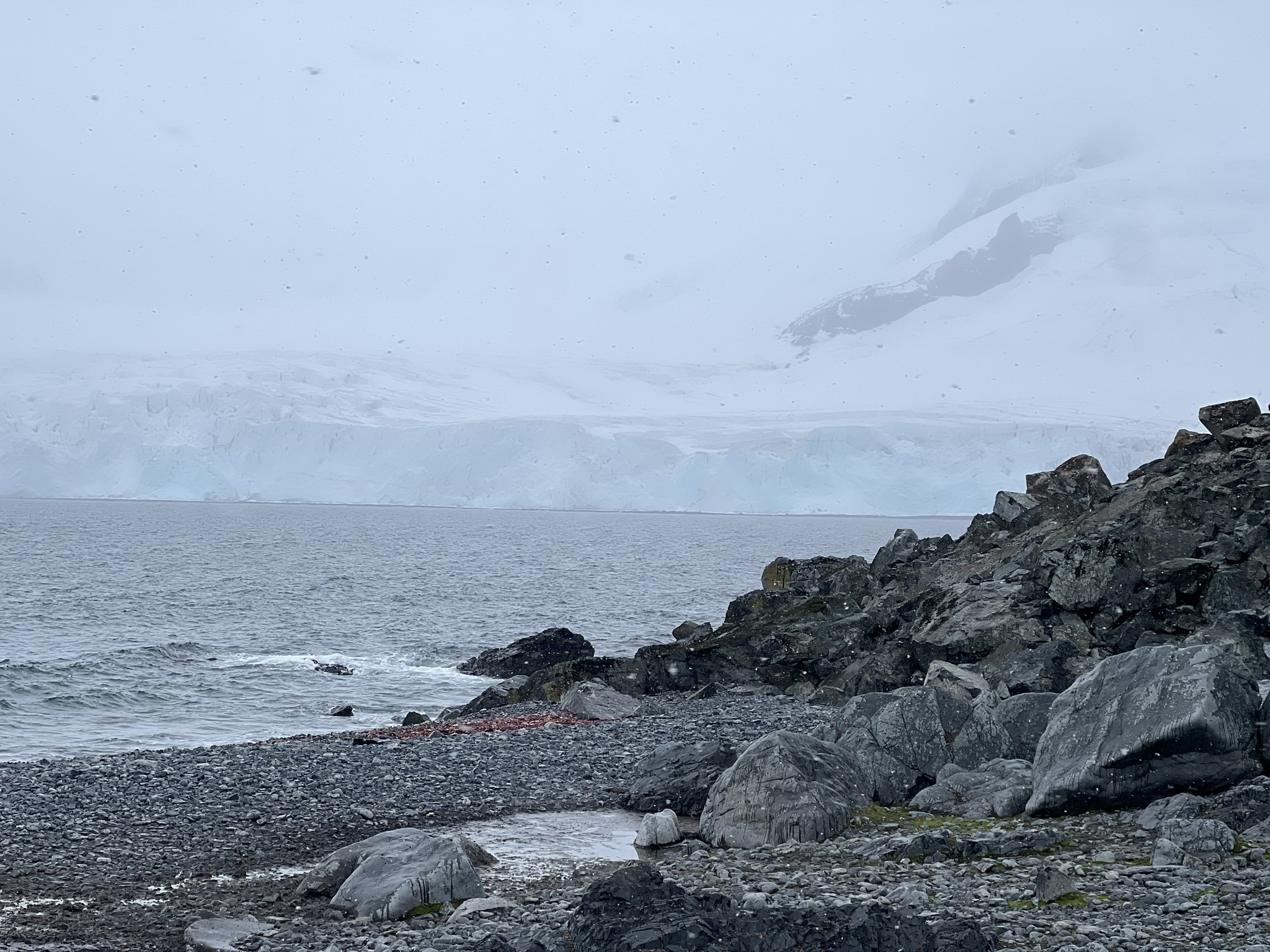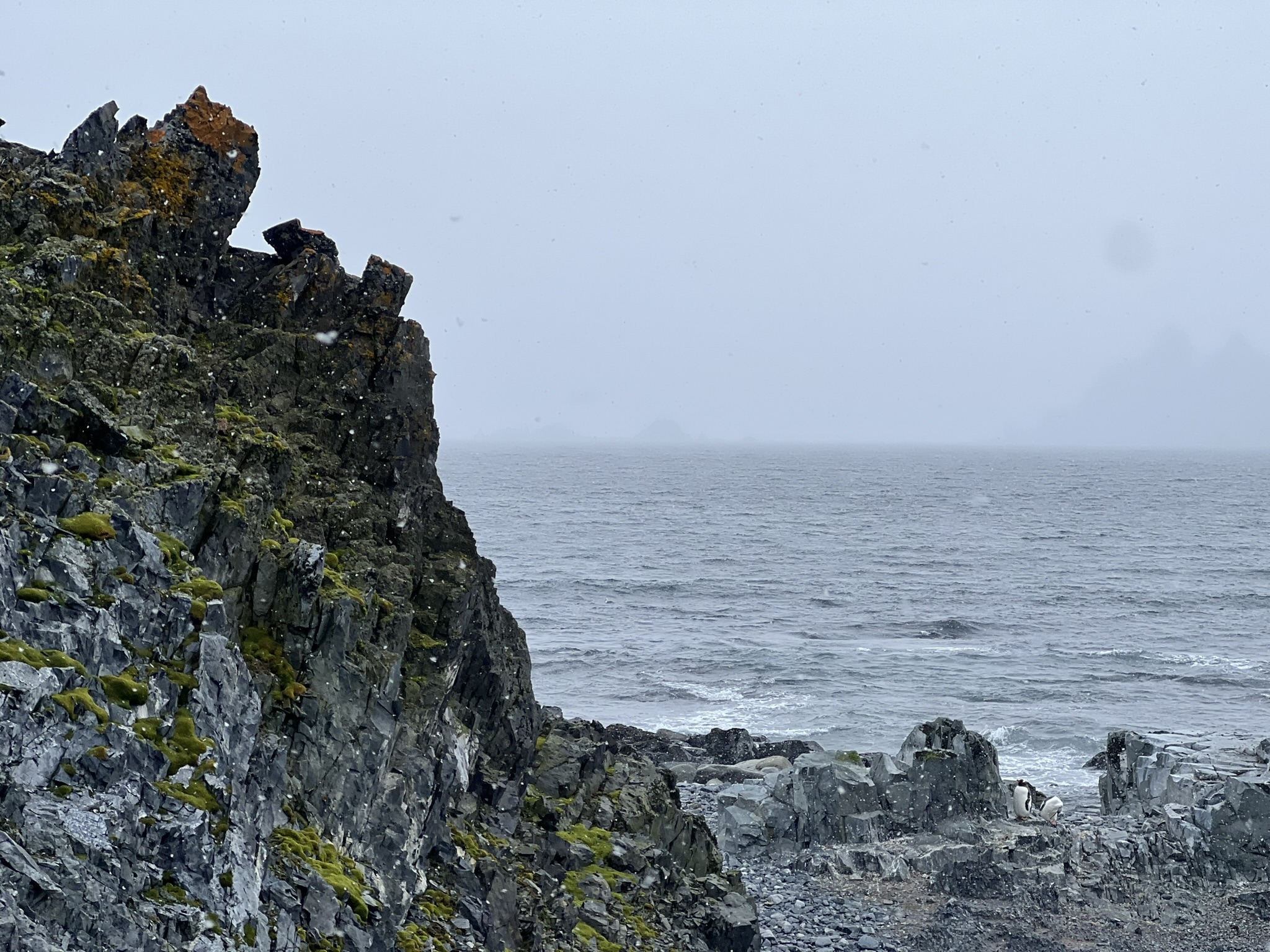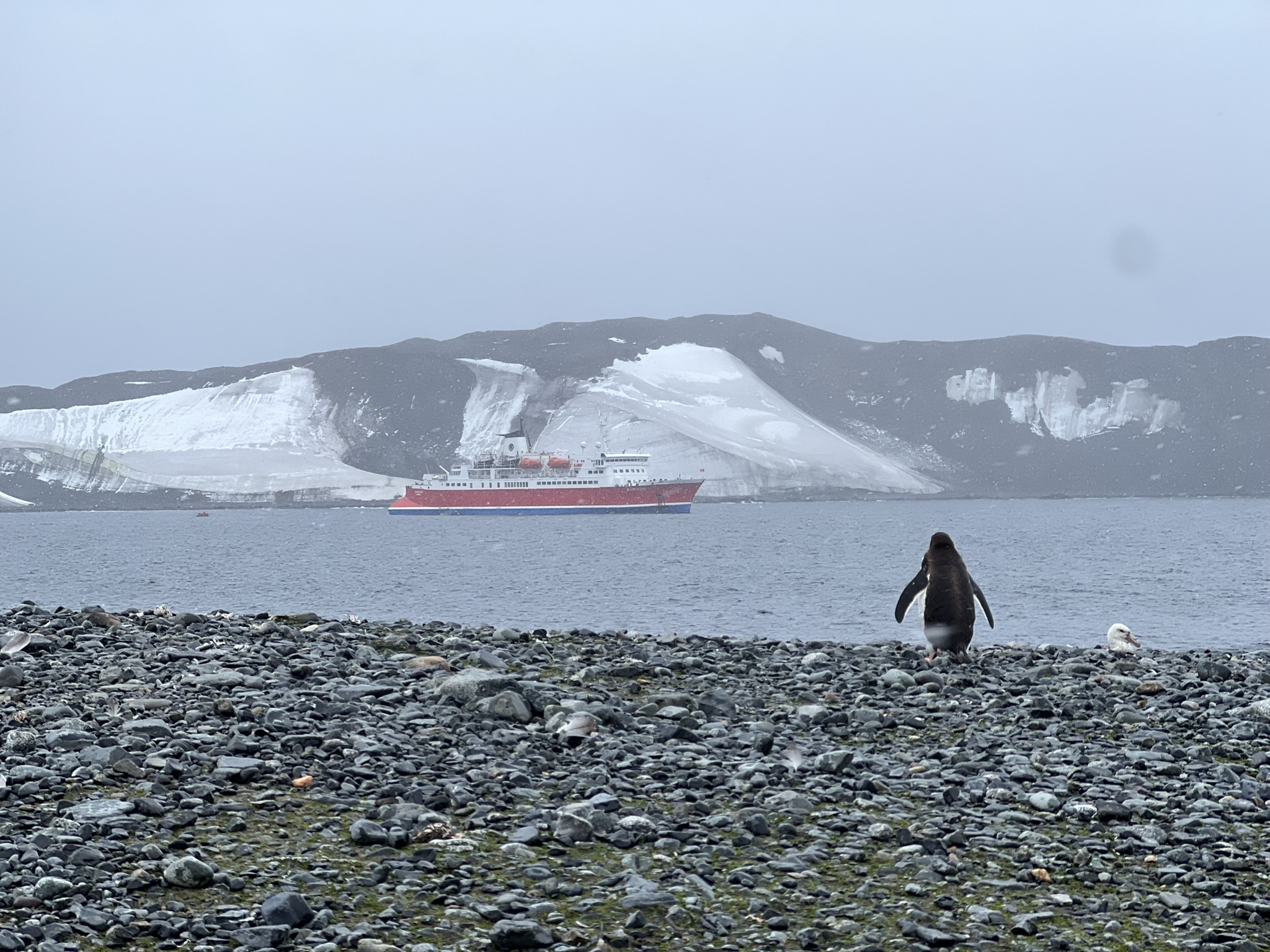 After spending a long time simply watching them, my attention shifted to the landscape around me. A black beach scattered with red kelp, white ice chunks, and patches of green moss and lichen unlike anything I’d ever seen, now enhanced by steadily falling snow. In the distance lay the remains of a moss-covered whaling-era water boat, a sobering reminder of the time when profit left a far heavier mark on Antarctic wildlife.