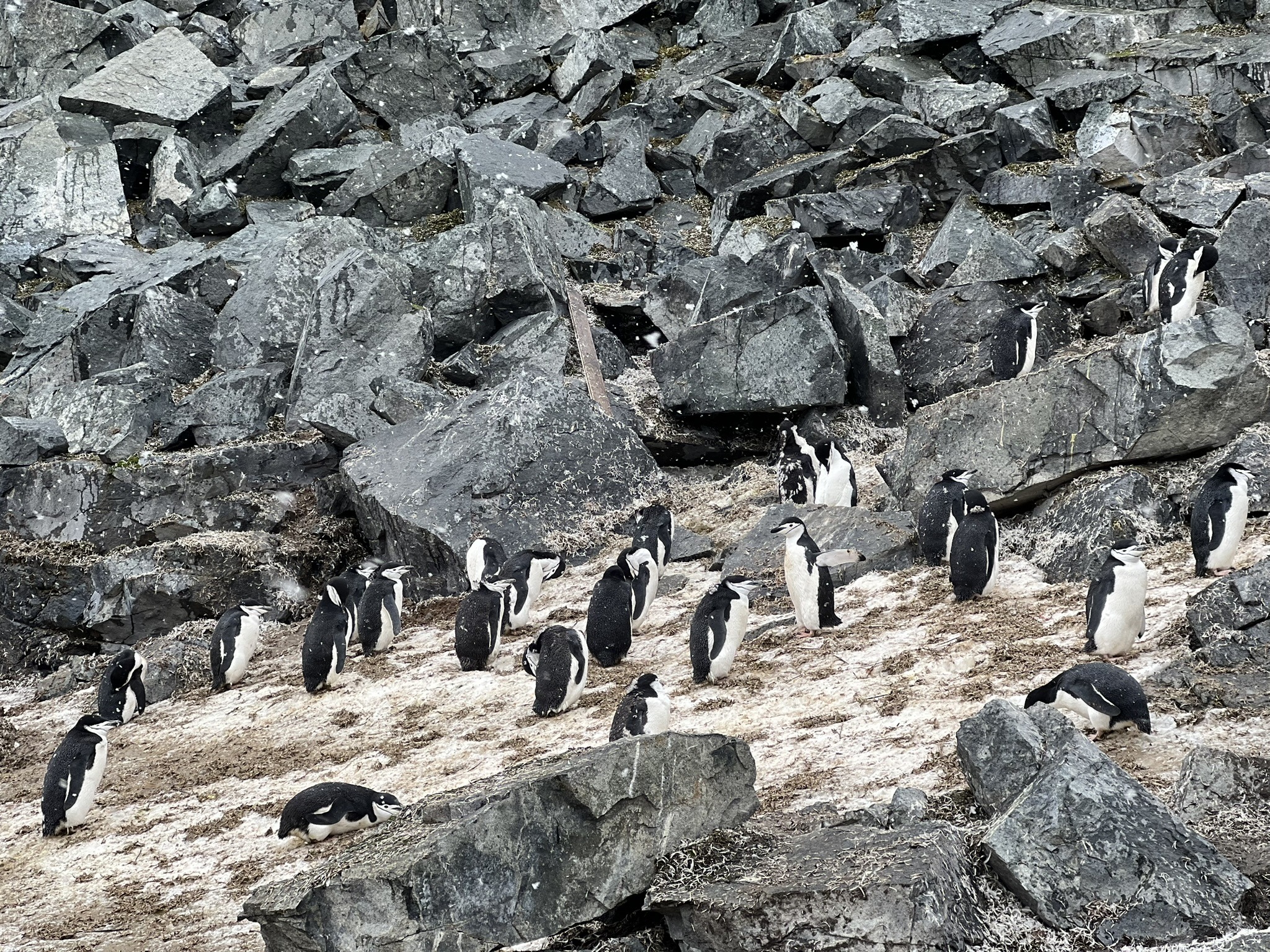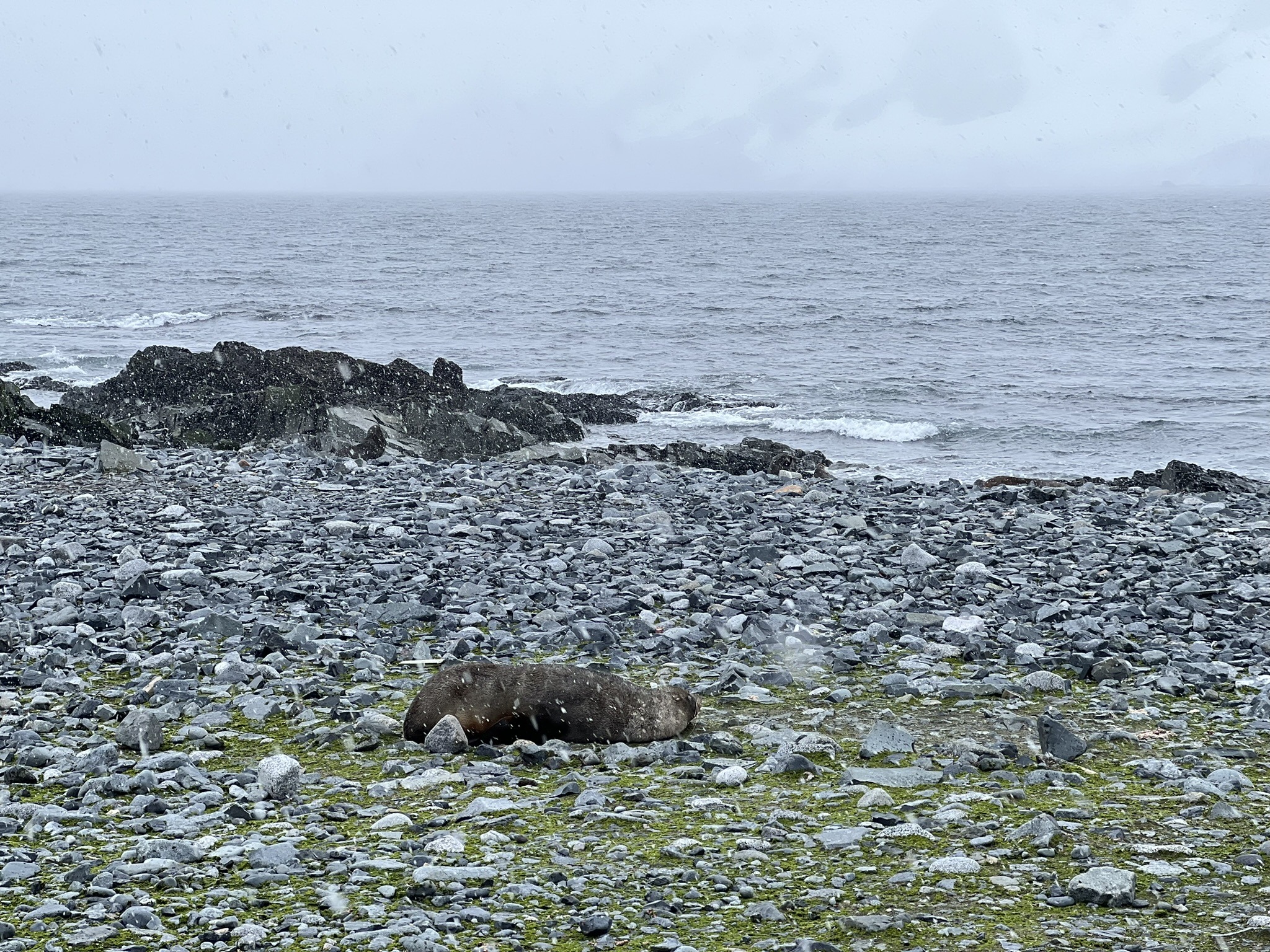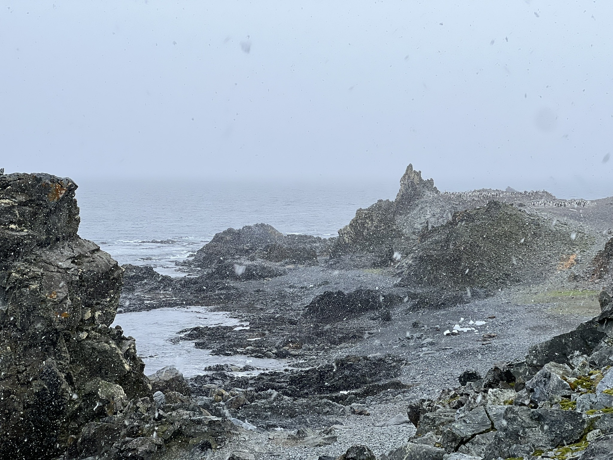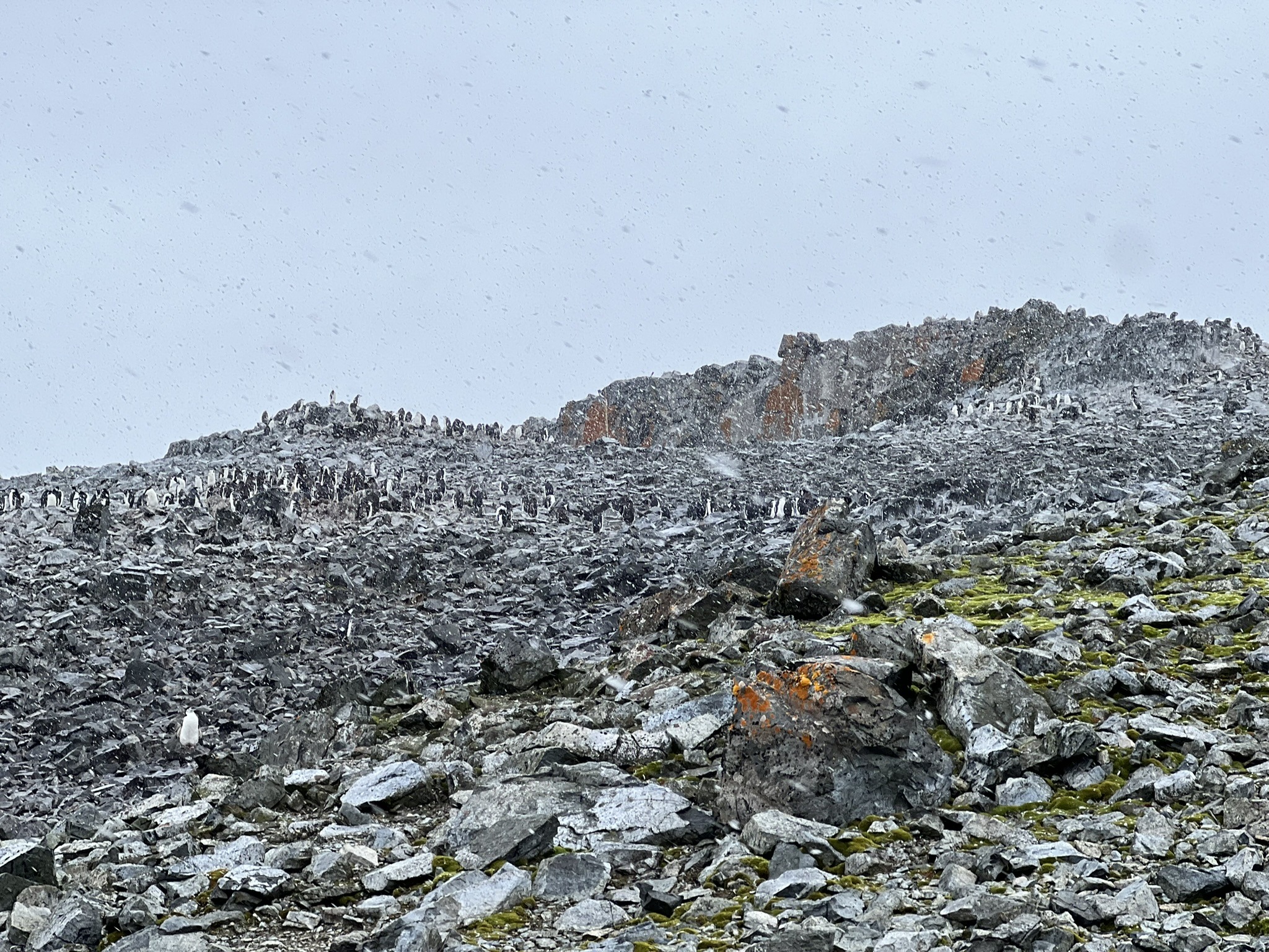 After spending a long time simply watching them, my attention shifted to the landscape around me. A black beach scattered with red kelp, white ice chunks, and patches of green moss and lichen unlike anything I’d ever seen, now enhanced by steadily falling snow. In the distance lay the remains of a moss-covered whaling-era water boat, a sobering reminder of the time when profit left a far heavier mark on Antarctic wildlife.