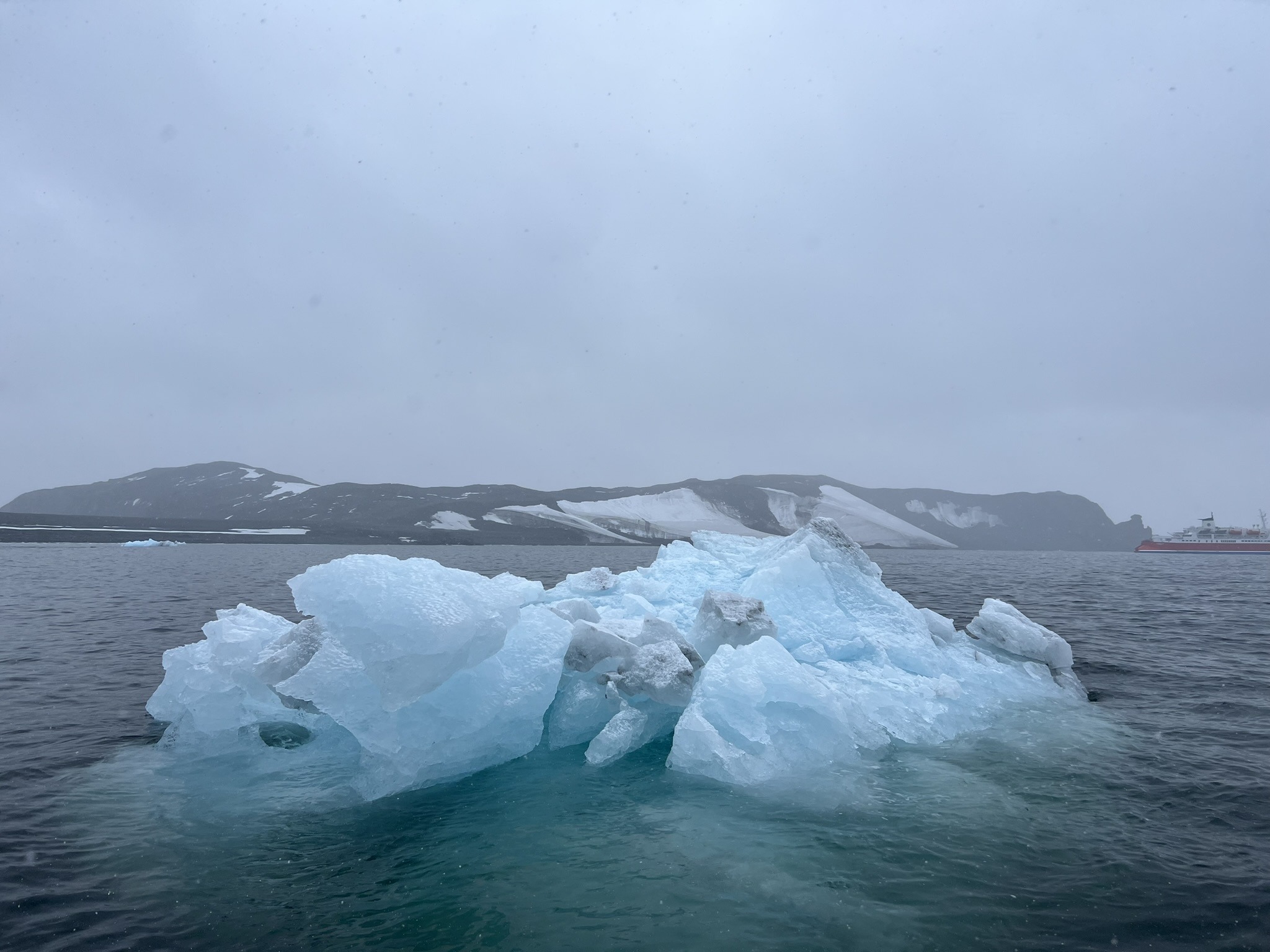 But the adventure wasn’t quite over. Matt, our Zodiac driver, took us around the island’s coastline and out into open water, weaving between tiny baby-blue icebergs bobbing at the surface. I couldn’t take my eyes off them. That colour didn’t seem real. Matt explained that ice that breaks off glaciers or ice shelves often appears white due to trapped air and snow cover, but dense, uncontaminated ice absorbs longer wavelengths of light, leaving blue light to scatter back. Ice containing algae or iron-rich sediments can appear green, yellow, or streaked with multiple colours. Matt passed around a chunk of ice, formed over thousands of years, likely the oldest water any of us had ever touched, or in my case, eaten.