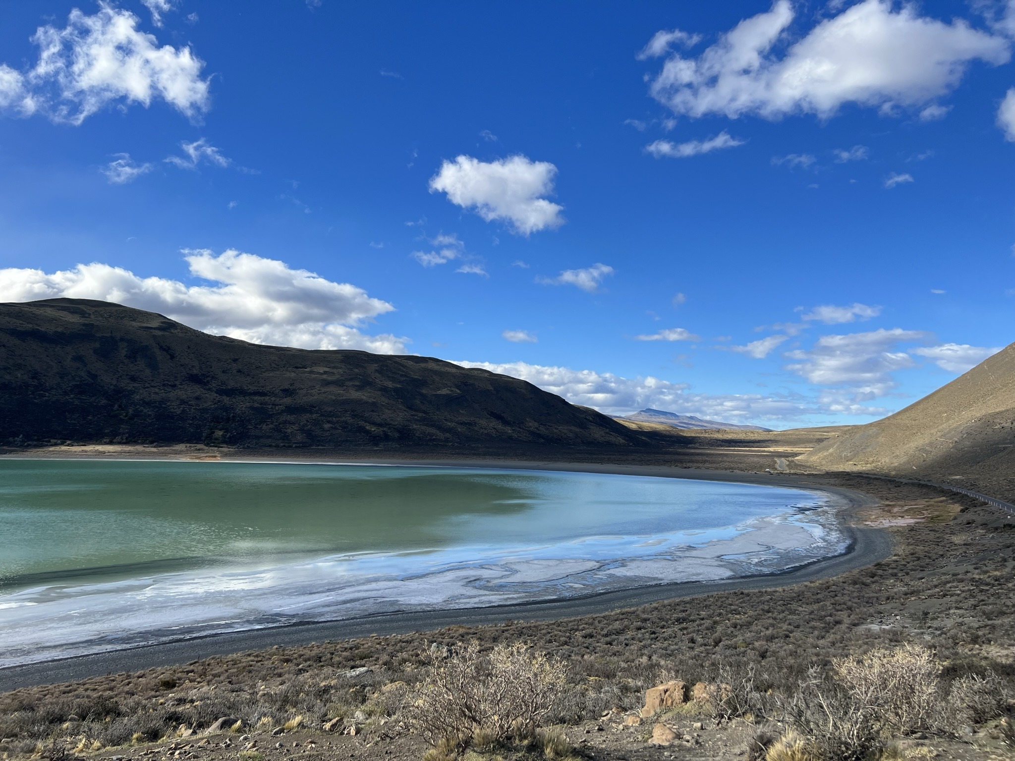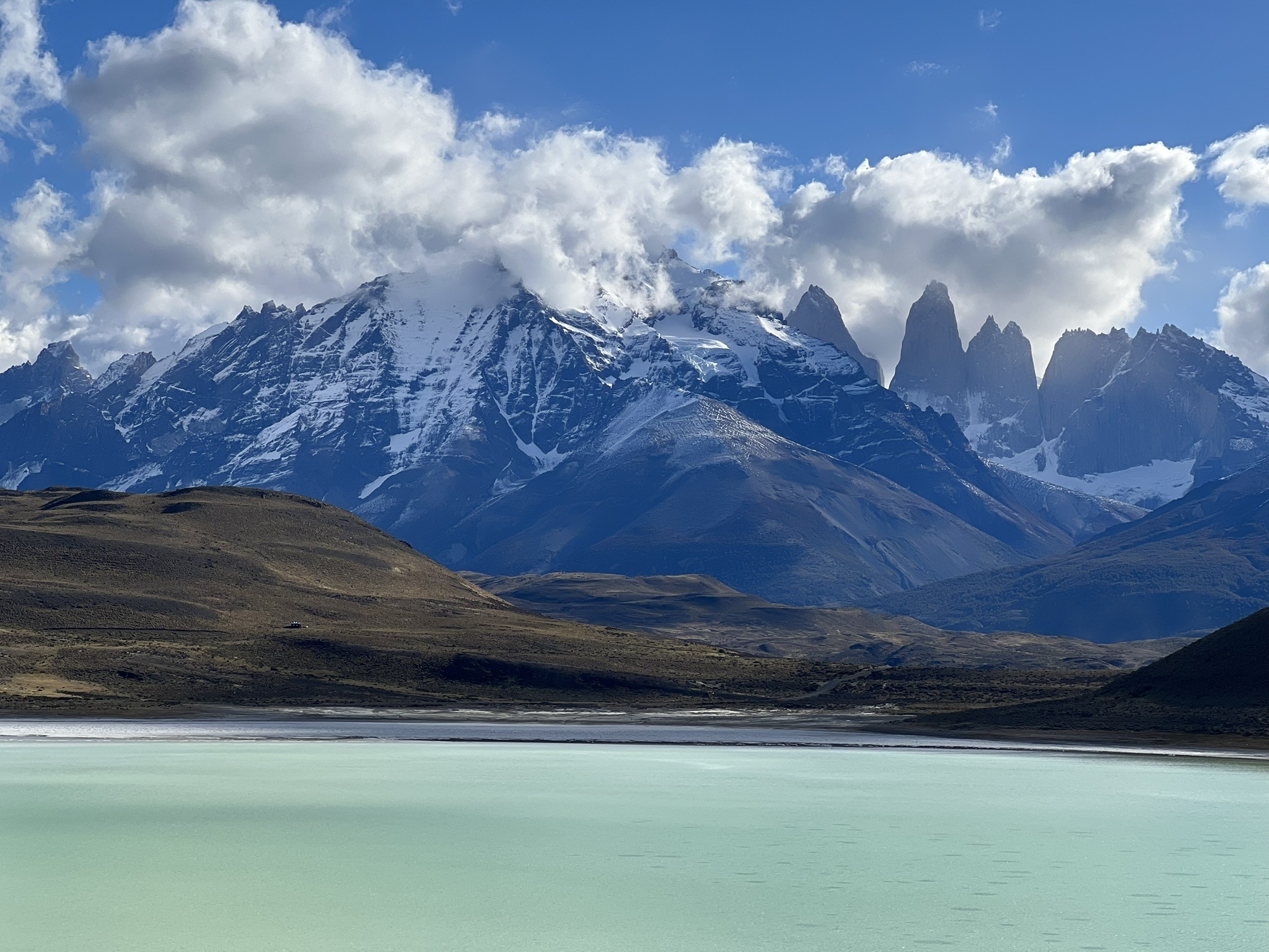 After about an hour and a half on the bus, my nap was abruptly interrupted by the vehicle slamming on its brakes. Assuming we’d arrived, I grabbed my belongings and rushed outside, only to be greeted by the breathtaking sight of Laguna Amarga. Its jade-coloured waters contrasted sharply with the dull green hills surrounding it and the icy mountain summits looming above.